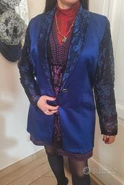 Giacca artigianale elegante di raso blu elettrico,con maniche e dettagli in pizzo sempre blu elettrico .Scollo a V rivestito di pizzo blu.Chiusa da bellissimo bottone gioiello di cristallo cangiante color verde smeraldo incastonato in montatura dorata.Dimensioni 42 cm larghezza spalle, 54 cm larghezza da ascella ad ascella,62 cm lunghezza totale.Ottime condizioni ,indossata due volte per serate di gala .Possibile consegna a mano ad Arcore,Monza,Sesto e a Milano