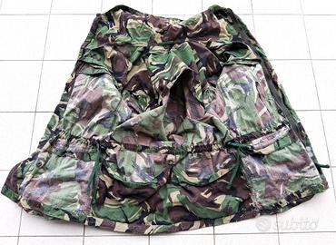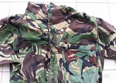 N771) Giacca da combattimento in tipico mimetismo DPM del Royal British Army, periodo anni '90. Modello fatto molto bene con cappuccio e cinghiette di serraggio regolabili in vita. E' stata normalmente usata, è in buone condizioni generali con qualche piccola riparazione da campo e normali segni di uso. La taglia non è riportata, può essere attorno ad una medium, le principali misure molto orientative e non impegnative sono; petto cm. 49 - spalle cm. 49 - manica cm. 57 - lunghezza totale posteriore da colletto parte superiore a fondoschiena cm. 74 (nessun impegno in merito alle taglie).