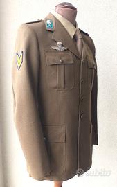 E' composto da giacca completamente mostreggiata con gradi, scudetto, brevetto metallico Paracadutista Militare attacco a spilla, coppia di mostrine (alcuni punti della vernice azzurra venuti via), pantaloni con cintura, camicia e cravatta , in condizioni molto buone con normali segni di uso e dell'età. La taglia del completo è 48 ed è etichettata E.I. con le stesse etichette sia sulla giacca che sui pantaloni. (nessun impegno su taglie, vestibilità ecc. la cedo esclusivamente come oggetto da collezione, grazie). Stupendo pezzo.