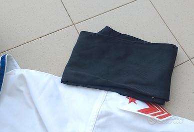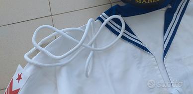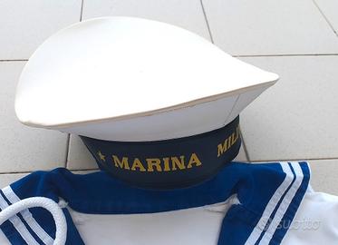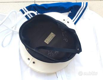 N459) Ottimo completo composto da giubba da marinaio completa del raro cordino bianco con fazzoletto nero d'ordinanza, e berretto appartenuto allo stesso militare alla fine degli anni '80. Il completo è stato poco usato, le condizioni sono davvero molto buone (presente qualche parte leggermente ingiallita come capita sui capi bianchi vintage). Non ci sono etichette ma la taglia della giubba è una 1° militare che era la più ampia quindi attorno alla 52/54, e il berretto è una ampia taglia 59. Veramente ottimo pezzo, molto difficile da reperire in taglia grande.