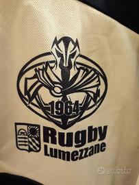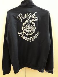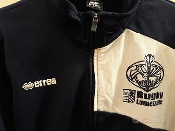 Giacca tuta del Lumezzane rugby, marca Errea, tg L (ascella 57 cm circa; altezza 68 cm circa; lunghezza maniche da polsino ad attaccatura colletto 78 cm circa). La scritta ed il logo Errea davanti sono ricamati in rilievo in filo bianco, mentre i loghi e le scritte del club davanti e sulla schiena sono termoapplicati in plastica. Presenta tasche laterali aperte; etichette interne sono state rimosse (vedasi foto). Articolo poco usato in ottimo stato generale e ben conservato.