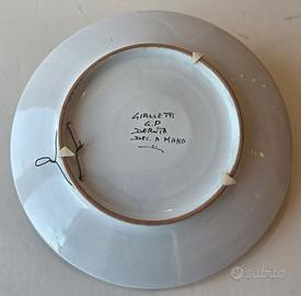 Piatto artistico in maiolica di Deruta firmato Gialletti & Pimpinelli, interamente dipinto a mano secondo la tradizione umbra.