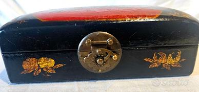 Portagioie realizzato in lacca nera e presenta un coperchio decorato con una scena tradizionale Giapponese. Dipinto a mano con figure umane in un contesto mitologico, ai lati sono presenti motivi floreali dorati, tipicamente usato per conservare gioiello o piccoli oggetti.