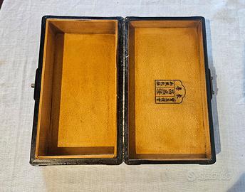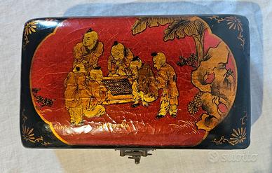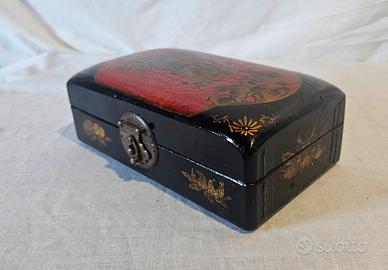 Portagioie realizzato in lacca nera e presenta un coperchio decorato con una scena tradizionale Giapponese. Dipinto a mano con figure umane in un contesto mitologico, ai lati sono presenti motivi floreali dorati, tipicamente usato per conservare gioiello o piccoli oggetti.