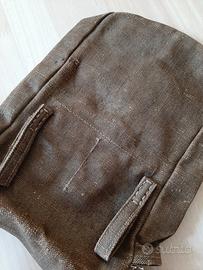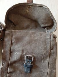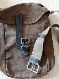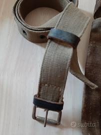 giberna militare con cintura in tela verde militare con passanti, chiusura in pelle nera e fibbia cintura in tela e rifinitura in pelle con fibbia