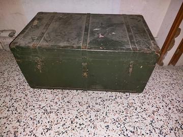Grande baule d'epoca in legno rinforzato, originariamente utilizzato dai soldati per custodire la divisa e il corredo personale.