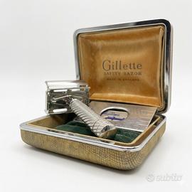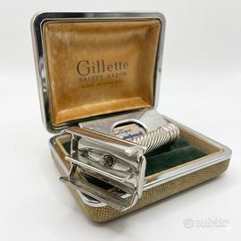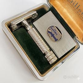 Gillette Aristocrat #66 – Made in England (Set Completo) Condizioni generali del rasoio: * Meccanica: Perfetta. Il meccanismo a farfalla si apre e chiude con estrema precisione; il click finale di bloccaggio è solido e fluido. * Estetica: La placcatura in rodio è integra al 100%, senza perdite di metallo, graffi profondi o segni di "pitting". La brillantezza è specchiata. * Geometria: Barre di sicurezza perfettamente dritte e allineamento della lama impeccabile. Questo non è solo uno strumento da barba, ma un investimento da collezione che può durare per generazioni. Un pezzo di storia della rasatura britannica in condizioni museali.