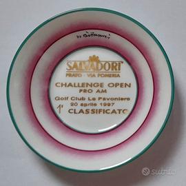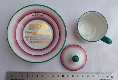 Questo elegante set in porcellana vintage composto da tazzina da caffè con coperchio e piattino fa parte della serie "Iride", caratterizzata da righe orizzontali rosa e finiture verde giada. Design raffinato che unisce tradizione artigianale e contemporaneità, nato dalla collaborazione tra la Richard-Ginori e Gio Ponti, che fu Direttore Artistico dell’azienda di porcellane più rinomata d’Italia dal 1923 al 1933. L’esordiente architetto rivoluzionò la storica produzione della manifattura, curando ogni aspetto della vita del prodotto aprì la strada allo sviluppo del design italiano. Il coperchio a cupola con pomello aggiunge un tocco di raffinatezza, rendendo questo set non solo funzionale ma anche un eccezionale oggetto da esposizione. La ‘trasformazione’ in trofeo golfistico aggiunge un ulteriore elemento di peculiarità.