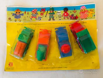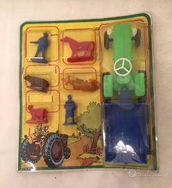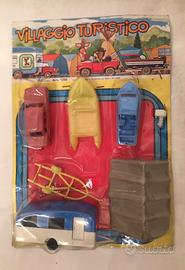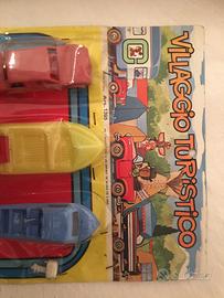 Tre confezioni originali mai aperte di giocattoli vintage anni 60 per bambini e collezionisti; 1 villaggio turistico con auto, gommone, motoscafo, motore, roulotte con rimorchio e tenda, 2 automezzi da cantiere, 3 trattore e animali da fattoria con contadini.