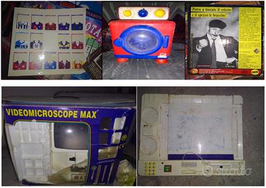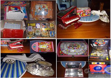 Statuetta apribile grande Jafar Disney Aladdin anni 90; chalet Barbie della Mattel in scatola originale coi componenti casa anni 80; scatole Tombola e Ruota della Fortuna con all’interno alcune parti anni 90;raro modello grande auto d’epoca per collezionismo anni 70 ben conservato salvo una ruota mancante,cura dettagli auto storica;raro carrion pianoforte anni 80 tenuto bene funzionante,meccanismo,musica, bella melodia;rarissimo scrigno portagioie salvadanaio d’epoca con chiusura tutto originale Sperlari anni 60,bellissime rifiniture artigianali,personaggi,storie,gioco dell’oca,conservato bene,raro,basamento artigianale color argento decorato anni 80;album quasi completo Le figurone Animali e Cuccioli anni 90;pagina album Panini maglie serie A anni 90;videocassette originali cartoni anni 90 incluse prime 2 puntate Dragon Ball GT quando GT non era in tv;cartella Cavalieri dello Zodiaco e fascicoli riviste tatuaggi ecc nuovi imballati mai aperti inclusa penna;cruci comics Batman non usato senza compilazioni né scritte;altri giochi vintage da sistemare,lavatrice,lavagna ecc; microscopio Videomicroscope Max ottimo stato anni 80 funzionante coi componenti strumenti in scatola originale;flipper ottime condizioni funzionante anni 90 Star Fighter Arcade Electronic LCD Pinball elettronico portatile luci e suoni tema spaziale, tabellone segna punti,interruttore on/off,schermo lcd,punteggio automatico,pulsante accendi/spegni e reset;storici videogiochi console Xbox 360 primi anni 2000 e console Game Player Console dei primi 90 con joystick vintage incluso, Xbox col proprio lettore cd dvd rom drive,ventolina aggiuntiva..probabilmente funzionanti ma nn essendo esperto le cedo come nn funzionanti x collezionismo,riutilizzo,rivendita,ricambi ecc;manuali fascicoli garanzia Nintendo;radio stereo karaoke AM/FM anni 90,casse,phones,2 piastre lettore musicassetta,registrazione e karaoke,portamicrofono incorporato e con microfono,da verificare.Tutt in blocco 180€ o singoli;posso spedire
