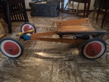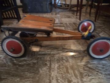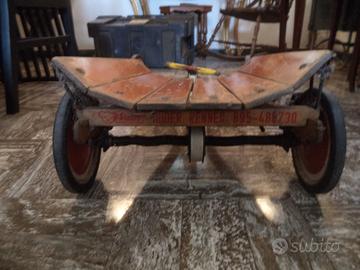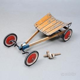 Un raro Go-Kart Steiff Ruder Renner n. 895-4887.30 anni '40 con sedile in legno a doghe con telaio in metallo e assi su 4 ruote a disco in metallo con pneumatici in gomma, con i marchi originali Steiff sul retro e nella parte inferiore. 84 cm di lunghezza x 46 cm di larghezza x 22 cm di altezza. progettato per essere guidato tirando una maniglia di legno con entrambe le mani, che è fissata a una cinghia che aziona l'asse posteriore tramite una trasmissione a molla elicoidale. Per la guida in discesa, il Ruder Renner è dotato di una leva del freno a mano, che agisce su entrambe le ruote posteriori. ultima foto presa da internet. buone condizioni vista l'età. spedizione difficile, meglio se venite voi a prenderlo a Pisa