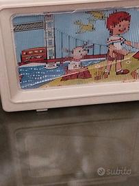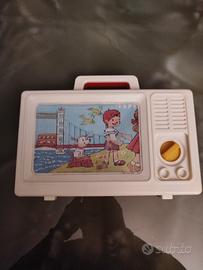 giocattolo carillon a forma di televisione vintage, anni 70 "My Kids È un giocattolo a carica manuale che non richiede batterie. Funzionalità: Caricando la manopola laterale, viene riprodotta una melodia (come "London Bridge is falling down") e contemporaneamente scorre un'immagine animata sullo schermo. Lo schermo ha una filatura che non compromette la funzionalità del gioco