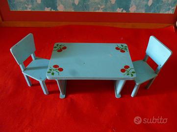 Casa di bambola degli anni 1940, 1950, sala da pranzo in legno dipinto in celeste con decorazioni di ciliegie, composto da tavolo, 2 sedie e credenza, in buone condizioni considerando l'età dell'oggetto, la pittura è scrostata in alcuni punti e sulla parte superiore della credenza, il legno presenta qualche piccolo foro, nessuna attuale presenza di tarlo