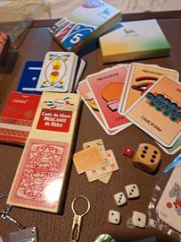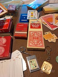 Valigetta con giochi 1987 "Idea mese",carte Comet,Mercante in fiera pubblicità Fiorucci salumi anni 80,Carte Valle d'Aosta con stemmi, carte Confidenze,portachiavi con blocchetto"rubrica"interno, portachiavi 1° trofeo Corvisieri 1994,dadi,carte varie in regalo,molti mai usati.