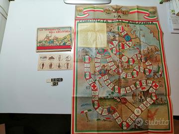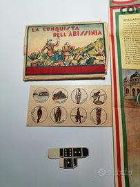 Gioco tipo dell'oca materiale carta e cartoncino anno 1936 con titolo ' la conquista dell' abissinia ' cromolitografia. Il percorso riproduce sommariamente alcuni dei momenti della guerra d' abissinia. Durante il fascismo molte tavole di giochi dell'oca, con espliciti intenti propagandistici, riproducevano i territori coloniali dell'Africa. Il gioco si compone di 68 caselle numerate e alcune di esse con didascalia e presente un dado di cartoncino da costruire in più una scheda con otto pedine originali ancora da staccare dalla sua confezione originale sempre in cartoncino e di una busta che conteneva il gioco le misure sono le seguemti 55 X 35. Le regole si trovano in alto a sinistra del gioco Il costo compreso di spedizione è di 185 euro pagamenti bonifico o Poste pay è preferibile ritiro a mano Napoli Vomero sono in vendita altri ciochi cartacei della mia collezione privata che trovi su quedto sito :1) GIOCO DELL'OCA LA GUERRA D'ETIOPIA 2) GIOCO LA GUERRA AEREA 3) GIOCO CARTACEO DEL MULINO A VENTO 4) CARTACEO MARCA STELLA GIOCO DEL TRAMWY 5) GIOCO LA CONQUISTA DELL'ABBISSINIA QUESTI SONO TUTTI GIOCHI TIPI GIOCO DELL'OCA