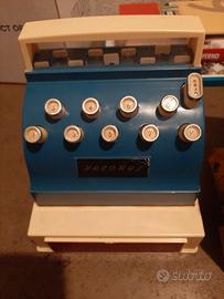 Gioco vintage da collezione "The supermarket cash register action toy": cassa registratrice da gioco vintage. In buone condizioni, senza scatola in cartone protettiva; gioco in plastica rigida, in colore azzurro. Pezzo anni '70-‘80 da collezione. Completo, con segni di usura e del tempo. Marca Nacoral. Prezzo trattabile