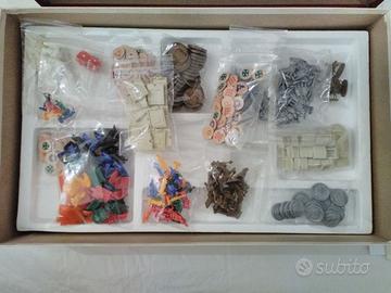 STATO DI CONSERVAZIONE. SCATOLA: i colori (specie del coperchio) sono un po' sbiaditi e in più essa presenta un danno nello spigolo in alto a sinistra della base (vedere foto 2; altre a richiesta); comunque, nell'insieme, è ancora solida e ben formata. CONTENUTO: buone condizioni generali: il gioco è stato certamente usato, ma le miniature sono ancora valide, la maschera di polistirolo per contenerle è ancora integra, la mappa non presenta danni; l'accessoristica è al completo, ad eccezione, forse, della tabella di combattimento, della quale, tuttavia, è presente una fotocopia. Nell'insieme, dunque, un gioco vissuto, ma ancora in condizioni dignitose.