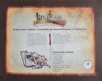 KONTESA GIOCO DA TAVOLO NUOVO ancora imballato, vendo per doppio regalo - Realizzato completamente con materiali ecocompatibili, Kontesa! è tra i primi, se non il primo in assoluto gioco in scatola ad impatto ambientale zero. Sviluppato in circa un anno di lavoro, il gioco è nato con lo scopo di far conoscere il territorio ai propri abitanti, che pur vivendoci spesso conoscono solo una minima parte di arte, storia, cultura, ecc. del territorio in cui vivono. Per la realizzazione delle 1200 domande è stato messo al lavoro un team di 12 esperti, due per ciascuna delle 6 materie su cui i giocatori si sfideranno per poter acquisire le risorse necessarie alla propria espansione territoriale e quindi accumulare punteggio. Non a caso il sottotitolo di Kontesa! è Il Libro e La Spada. Infatti oltre alle carte con le domande ci sono un buon numero di carte di combattimento che i giocatori possono utilizzare per le loro strategie di conquista dei territori, in aggiunta al piazzamento delle pedine (rigorosamente in pietra naturale). Il gioco non utilizza dadi, saranno la strategia e conoscenza del territorio di ciascun giocatore a pesare sul risultato di vittoria finale! Dotato di una veste grafica accattivante, con un tabellone di generose dimensioni (70x80) diviso in 10 aree. Questo gioco è focalizzato sulla realtà storica, culturale, artistica, geografica della provincia di Bergamo - possibilmente per cortesia scrivete su whatsapp se potete. 3922490702 - Milano Lambrate – Grazie