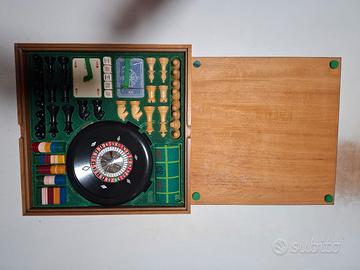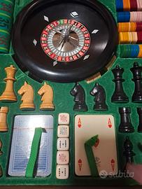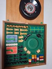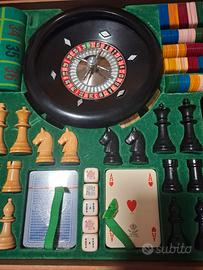 Scatola da gioco vintage anni 70 con Scacchi, Dama , Roulette pari al nuovo con mazzi di carte ancora confezionati.
