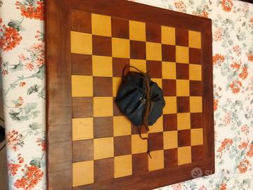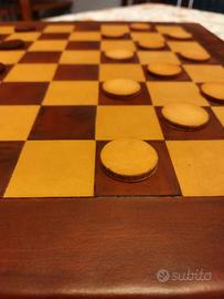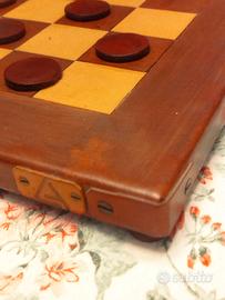 Tavola da Gioco Dama in perfette condizioni, da collezionista o amatore. Realizzato in legno e foderato in pelle, pedine con sacchetto in pelle. Sul retro è raffigurato un quadro " Incas oro del Perù".