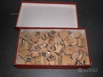 Gioco della tombola antico formato da pedine rotonde e quadrate fatte in legno artigianale.