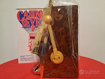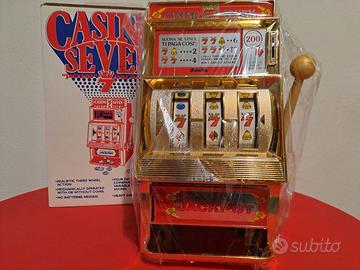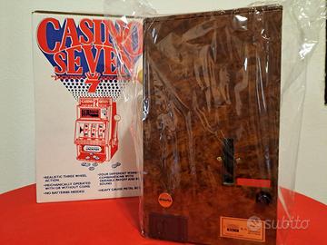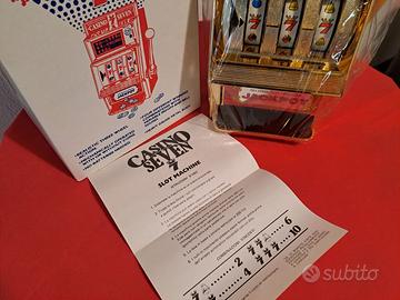 La Slot Machine Casino 7 è oggi un oggetto vintage da collezione che può essere utilizzato per una serata tra amici ma che può trovare posto anche su un qualsiasi mobile per arricchirne l’arredo. Era distribuita dalla nota azienda specializzata in giochi Didatto. Le sue misure sono: larghezza cm 22, altezza cm 35 e profondità cm 20. E’ realizzata con parti metalliche e parti plastiche. La macchina può essere utilizzata con o senza monete che, come descritto nelle istruzioni, danno solo una maggiore percezione della “vincita”. Se si realizza la giusta combinazione la macchina emette un suono e nel caso si siano utilizzate le monete, le stesse vengono rilasciate. Questa Slot Machine non è mai stata utilizzata ed è ancora nella sua confezione originale come mostrano le foto.