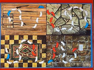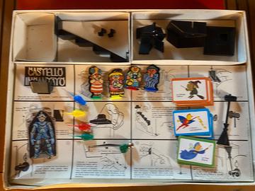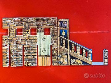 Castello incantato quasi completo; edito da MB in edizione italiana. In condizioni abbastanza buone in generale, considerata l'età: ci sono delle pieghe e qualche mancanza (vedi foto scala); la scatola è stata chiusa con dello scotch e ci sono delle ammaccature. Credo che ci siano tutti i componenti, tranne 2 supporti di plastica per tenere la scenografia e 1 pezzo della scopa.