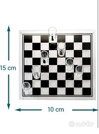 Contenuto: scacchiera, 32 bicchierini (ca. 1 cl cadauno), scatola con manico trasportabile