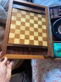 Scatola in Legno contenente Roulette, scacchi, dama e carte da gioco