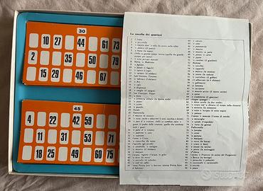 Gioco tombola vintage "Edizioni Stella Milano" completa comprensiva di 48 cartelle arancioni, tabellone numerato, sacchetto in tessuto con numeri in legno e foglio originale della "Smorfia dei quartieri"; un pezzo da collezione ideale per gli amanti del genere retrò