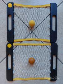 Questo set "tira-e-molla" è pensato per due giocatori e comprende due racchette speciali con una superficie a rete elastica simile a un trampolino, utilizzate per far rimbalzare una pallina tra i partecipanti.