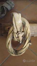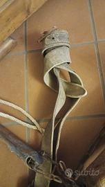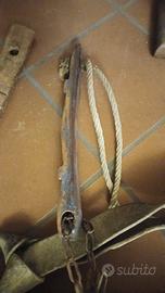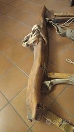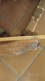Giogo tradizionale in legno, un antico strumento agricolo utilizzato per accoppiare due buoi e permettere loro di trainare aratri o carri. Ecco alcuni dettagli su questo tipo di attrezzo: Materiale e struttura: Costruito in legno resistente, sagomato per adattarsi al collo o alle corna degli animali. Funzione: Distribuiva il peso del carico in modo uniforme tra la coppia di buoi, facilitando il lavoro nei campi. Uso storico: Era fondamentale nell'agricoltura tradizionale prima dell'avvento dei trattori a motore. Stato attuale: Oggi è considerato un oggetto di antiquariato o da collezione, spesso esposto come testimonianza della civiltà contadina.