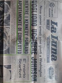 GIORNALE INTERO Questa prima pagina del quotidianoLa Luna(edizione del mattino) risale a domenica9 giugno 1968. Si tratta di un reperto storico di grande impatto, poiché documenta uno dei momenti più drammatici e tesi della storia americana e mondiale del XX secolo. Notizie Principali Minacce a Lyndon B. Johnson:Il titolo cubitale "VOGLIONO UCCIDERE JOHNSON" riporta la notizia dell'arrivo a Washington di nove uomini armati con l'intento di attentare alla vita del Presidente degli Stati Uniti. Il Caso Kennedy:Il sottotitolo evidenzia le dichiarazioni della famiglia Kennedy riguardo a un "aperto complotto". Queste affermazioni seguono di pochi giorni l'assassinio diRobert F. Kennedy, avvenuto il 6 giugno 1968 a Los Angeles. Le foto mostrano la vedova Ethel Kennedy in preghiera e i figli ai funerali. Cronaca Sportiva:Sulla destra viene riportata la tragica morte del pilota italianoLudovico Scarfiotti, avvenuta durante una prova in Germania alla guida di una Porsche. Curiosità Storiche Il giornale riflette perfettamente il clima di incertezza e violenza politica di quell'anno.