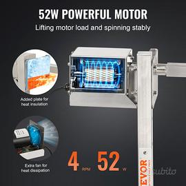 Motore Potente da 52 W: arrostire è facile con il kit girarrosto universale! È dotato di un motore potente da 52 W che fa girare senza sforzo l'asta dello spiedo a una velocità di rotazione di 4 giri/min. Anche incluso una piastra e una ventola per fornire un eccellente isolamento termico e dissipazione per la comodità.