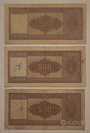 GIRO COMPLETO DELLA BANCONOTA DA 500 LIRE ITALIA ORNATA DI SPIGHE, TUTTI I DECRETI EMESSI 1947, 1948 E 1961. CONSERVAZIONE COME DA FOTO