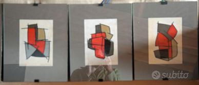 5 quadri in serie di Giuliano Trevisan realizzati con tecnica mista su carta nel 1972 dall’artista veneto. Le cinque opere, adeguatamente incorniciate con doppio vetro e passpartout color tortora, sono in perfetto stato di conservazione. Misure: 17 x 26 (con cornice 36 x 29) Il soggetto astratto, presenta una tecnica mista formata da collage e pittura acrilica. NON SI VENDONO SEPARATAMENTE