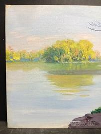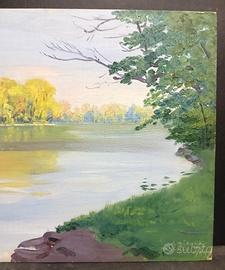 Olio su tela cartonato 39,5x29,5cm (cornice assente), Monaco di Baviera paesaggio fluviale sul fiume Isar.