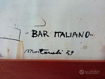 Giuseppe Martinelli (Viareggio 19/01/1930 - Milano 15/07/2016.) Bar Italiano 1959 - Tecnica mista su carta in cornice lignea. Firmato e datato in basso a destra. Sul retro etichette di carta per l'esposizione nel 1968 alla "V Mostra Nazionale della grafica di costume e dell'incisione" contenente nome del pittore, titolo dell'opera, dimensioni cm 50 x 70 e data della Mostra 1968. In buone condizioni. Artista esponente del movimento artistico definito "Realismo esistenziale", toccato dalla corrente informale, aderì anche ad uno stile figurativo di tipo espressionista. Le ultime realizzazioni lo vedono impegnato in tecniche miste con una gestualità ed una emozionalità che si fondano sempre più con l'astratto. Sue opere sono conservate anche al Museo Permanente di Milano e nella Pinacoteca Tosio Martinengo di Brescia.
