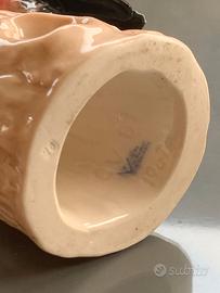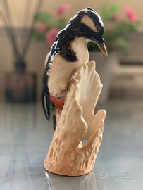 Statuetta in porcellana faunistica raffigurante un picchio rosso maggiore su un vecchio ceppo d'albero.