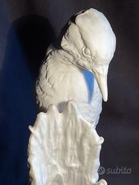 Statuina in porcellana satinata bianca raffigurante un picchio aggrappato ad un tronco d’albero.