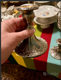 RARITA: COPPIA PREGIATI CANDELIERI GORHAM CHANTILLY placcati argento, modello YC3004. Caratterizzati da motivi floreali e rocaille in stile francese, presentano una base ampia e decorata con motivi ornamentali tipici dello stile Chantilly, con un fusto elegante che si assottiglia verso l'alto.CONDIZIONI: ottimo stato conservativo ma essendo un articolo antico/vintage può presentare i lievi segni del tempo che ne attestano l'originalità e il fascino.