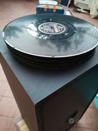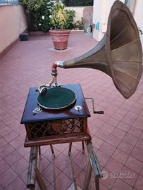 GRAMMOFONO A DOPPIA TROMBA UNA ESTERNA QUELLA NOTA IN OTTONE ED UNA INTERNA VEDI FOTO 5 TUTTO ORIGINALE . DI MARCA TEDESCA E L'ANNO DI COSTRUZIONE NONCHE ALTRI DATI SI LEGGONO NON FACILMENTE SUL FOGLIO DI CARTA INCOLLATO SUL COPERCHIO DI SOTTO NELLA PARTE INTERNA VEDI FOTO 4. E" STATO APPENA RISTRUTTURATO ED E' RITORNATO AL SUO ANTICO SPLENDORE E FUNZIONA CORRETTAMENTE IL TUTTO E CORREDATO DI 16 DISCHI 78 GIRI ANNI 30 E SUCCESSIVI VARI AUTORI ,CANZONI. UNICA PECCA E' LA TROMBA IN OTTONE CHE E STATA LUCIDATA PARZIALMENTE SOLO LA PARTE DELLA CURVA CHE E IN RAME ED OTTONE CON TIMBRO ORIGINALE E MI HANNO DETTO CHE ORIGINARIAMENTE(LA CURVA) ERA VERNICIATA DI NERO E POSSIBILE AVERE ANCHE ALTRE FOTO A RICHIESTA SU WHATTSAPP. NELLA PARTE ANTERIORE C'E' UN INTARSIO CON AL CENTRO UNA TESTA DI VECCHIETTO CON CAPPELLO OVE DIETRO VI E' POSTA LA TROMBA INTERNA.