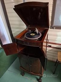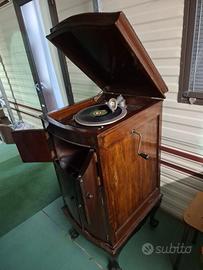 Splendido grammofono a cabinet (mobile) originale degli anni '20, marchio "IDEAL". Un pezzo di antiquariato dal fascino intramontabile, perfetto sia per collezionisti che come complemento d'arredo vintage. Caratteristiche: Struttura in legno pregiato con gambe mosse e vani porta-dischi. Meccanismo a manovella originale. Condizioni: Il mobile è ben conservato (vedi foto). Il meccanismo è perfettamente funzionante e testato con dischi a 78 giri. Incluso: il disco che si vede in foto e le puntine di ricambio Dimensioni: A 100 cm ( con coperchio chiuso ) - L 50 cm - P 50 cm Prezzo Trattabile - telefonare al 3317230455 Romolo Disponibile per visione e prova. Dato il peso e la delicatezza dell'oggetto, si predilige il ritiro a mano a Reggio dell'Emilia. Un piccolo avvertimento: Non provare mai a suonare un moderno disco in vinile (33 o 45 giri) su questo grammofono: il peso della testina lo distruggerebbe all'istante!