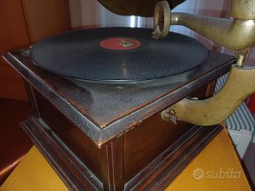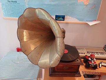 Vendo raro grammofono Columbia Grafonola d’epoca, in ottime condizioni generali. Questo elegante pezzo è dotato di una grande tromba in metallo brunito e cassa in legno con marchio originale Columbia applicato sul frontale.