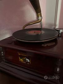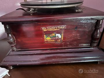 Questo è un bellissimo grammofono decorativo, una riproduzione moderna in stile HMV (His Master's Voice). È ideale per chi cerca un pezzo d'arredo di grande impatto visivo.