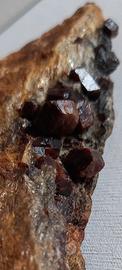Esemplare di Granato (varietà Almandino) incastonato nella sua matrice originale di micascisto. Il pezzo si distingue per la suggestiva crescita dei cristalli lungo la cresta della roccia, creando un contrasto cromatico molto elegante tra il grigio-argenteo della matrice e il rosso cupo dei granati.