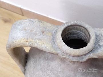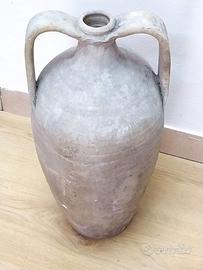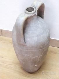Proponiamo una suggestiva anfora bimansata di grandi dimensioni (altezza 55 cm), realizzata in terracotta. L'oggetto si rifà fedelmente alle forme classiche delle giare mediterranee antiche.