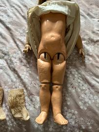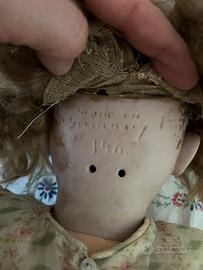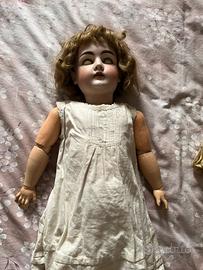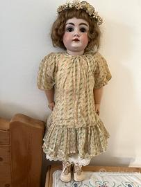 Grande bambola Kestner, modello 146, alta 65 cm., testa in bisquit pallido con occhi dormienti marroni, corpo in composizione, priva di difetti e completa di parrucca (incollata alla testa), abito in organza con sottogonna e mutandoni in cotone, calze in cotone lavorato e scarpine in pelle marrone. Coroncina di fiori in testa.