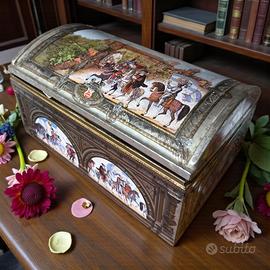 Non è una scatola. È un racconto medievale chiuso in latta. Norimberga. Le mura, i tetti rossi, i cavalieri in corteo, gli stemmi araldici. Una scena che sembra uscita da un libro illustrato antico. Questa grande biscottiera in latta litografata firmata Schmidt nasce negli anni ’70–’80, quando la tradizione tedesca reinterpretava con gusto romantico le proprie radici medievali. Il coperchio bombato amplifica l’effetto scenografico. La grafica è ricca, dettagliata, teatrale. E la patina del tempo – piccole ossidazioni, segni d’uso – non la penalizza: la rende vissuta. È una scatola che non si nasconde in un mobile. Si espone. Perfetta per uno studio, una libreria, una casa di montagna o un angolo che ha bisogno di carattere.