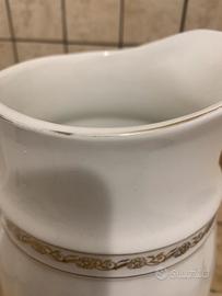 Ceramiche Laveno, grande brocca buanca con decoro a picvoki fiori dorati, e bordi dorati. In alcuni tratti il bordo si presenta lievemente sbiadito